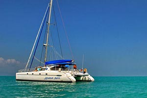 Kindred Spirit can comfortably take 20 passengers on a day trip, and sleeps 6 on over-night excursions. The starboard hull has a double stateroom with en-suite bathroom and living area. Two double state rooms in the port hull share a bathroom. The large galley and living area features hot and cold pressurized water, a fridge/freezer, gas cooker and electric oven. A CD/DVD player and a 28 inch colour TV complete the living area. All the cabins and living areas are fully air-conditioned. |
